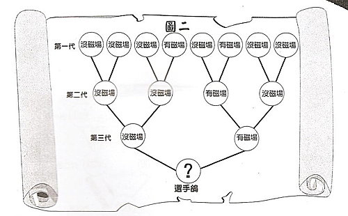 (2)然而在配對的過程仍會配入另外半數非磁場鴿,故在第一代時會出現三種配法,即有磁場配有磁場,沒磁場互配,及有磁場配沒磁場。